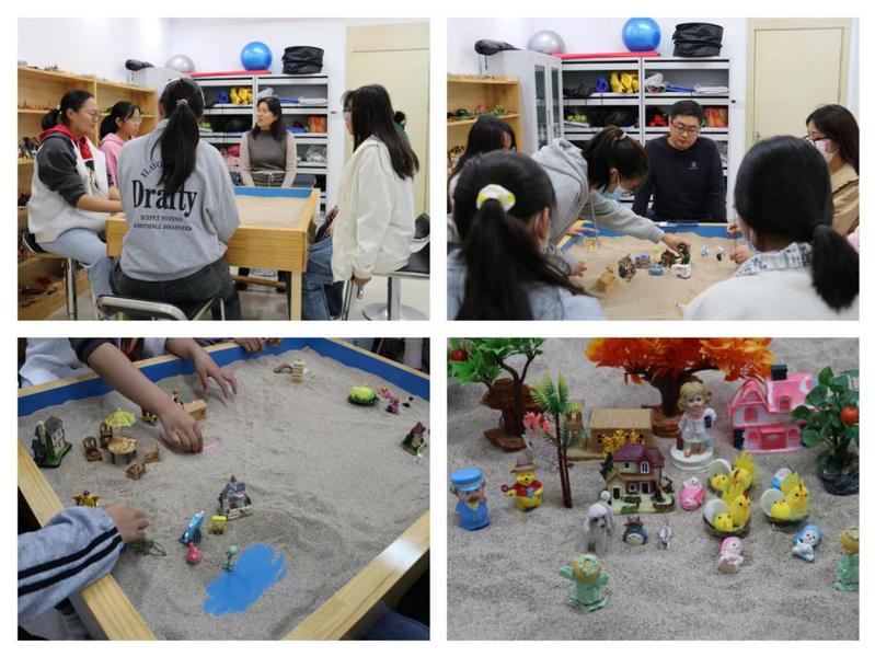 在沙盘体验活动中,同学们在心理中心老师的带领下感受沙子、熟悉沙具,并根据内心的想法,在沙盘上轮流摆放沙具或改变沙子形状。经过几轮的摆放和分享,老师与同学们讨论沙盘游戏过程中的一些现象,并引导他们对投射的问题进行思考。每一轮的创作,让大家逐渐有了默契,这是认识自我的过程,也是接纳他人的过程。在一个多小时的活动中,同学们深切感受到了“换位思考、理解别人的感受、不要急于判断、合作的力量”等在宿舍和谐关系中的重要性。